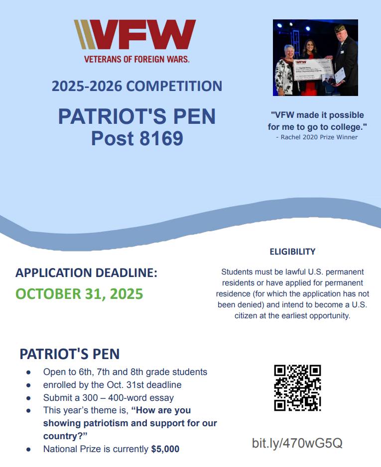 The 2025–2026 Patriot’s Pen Essay Competition is now open through VFW Post 8169!