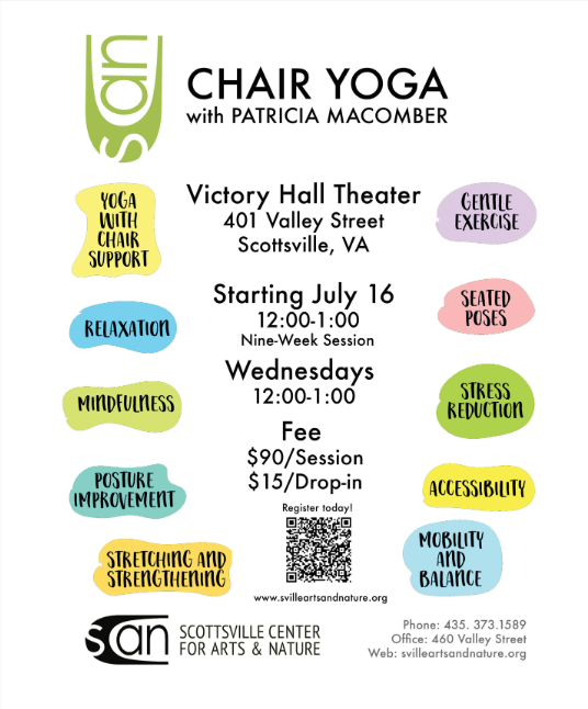 Join Patricia Macomber for Chair Yoga at Victory Hall! Held every Wednesday from 12-1pm, come to learn how utilize chair support during yoga for gentle exercise, stress reduction, mobility and balance, mindfulness, posture improvement, accessibility, stretching and strengthening.