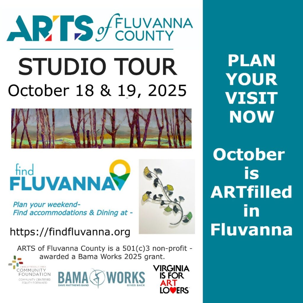 The fourth annual Arts of Fluvanna Studio Tour will be Saturday and Sunday, Oct. 18 and 19. The free, self-guided tour includes 17 studios of local artists, and 26 total artists. It will feature 5 new artists.