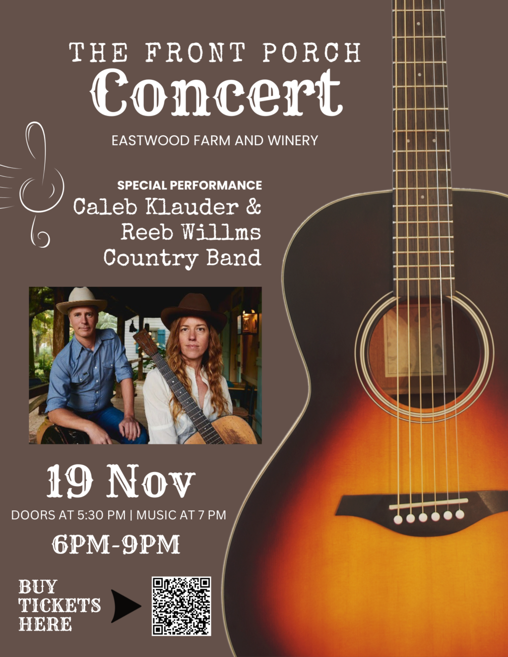 Reserve your tickets and join for this special Front Porch Concert at Eastwood Farm and Winery on Wednesday, November 19! Doors open at 5:30 PM, includes a two-step dance lesson, and music starts at 7 PM. This show is a mix of seats and standing, dancing encouraged! Guests are welcome to order food and beverages from Eastwood during the event.