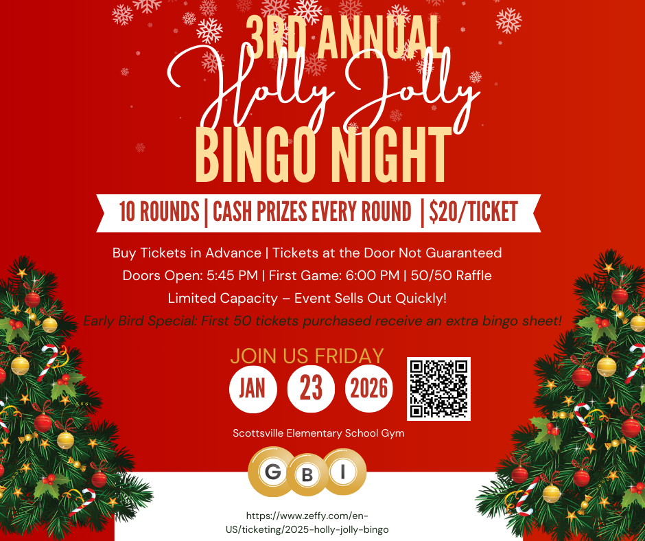 Scottsville Elementary School has rescheduled its Holly Jolly Bingo following inclement weather. The annual event will now take place on Friday, January 23, 2026 and tickets are still available here!