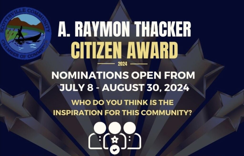 Who do you think is an inspiration in the Scottsville community? Nominate them today for the 2024 A. Raymon Thacker Citizen Award! Longtime Mayor of Scottsville, Thacker’s legacy lives on through this award recognizing special citizens in our community who strive to make a difference.