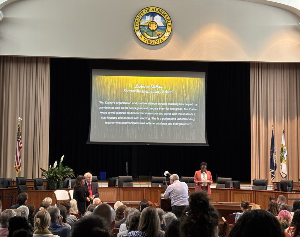 This year, LeAnna Dalton was selected and celebrated as Scottsville Elementary School’s 2025 Golden Apple recipient. Dalton currently teaches kindergarten at SES. She has been at the school for 13 years and within ACPS for 15 years.