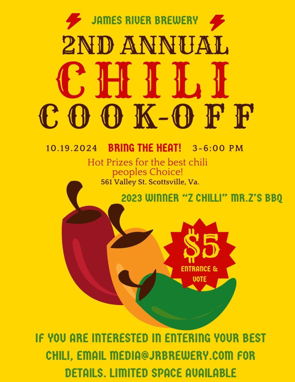Everyone is invited to bring the heat this October at the 2ND Annual Chili Cook-off at the James River Brewery! Sign up now as space is limited. Prizes for best chili!