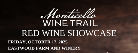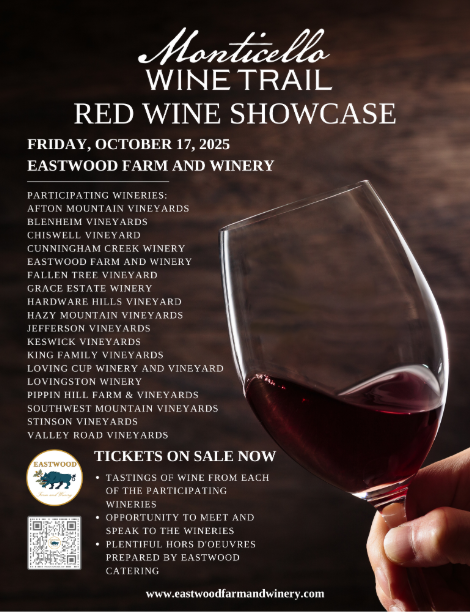 On October 17th, join for a celebration of exquisite Virginia wines set against the picturesque backdrop of Eastwood Farm and Winery. As part of Virginia Wine Month, this exclusive event brings together 18 esteemed wineries from the Monticello Wine Trail for an unforgettable evening of red wine tastings, gourmet pairings, community and conversation. Discover the exquisite and robust flavors of our red wines – from fruit-forward Merlots to earthy Cabernet Francs and full-bodied Meritage blends, each wine offers a unique expression of the region’s terroir and winemaking craftsmanship.