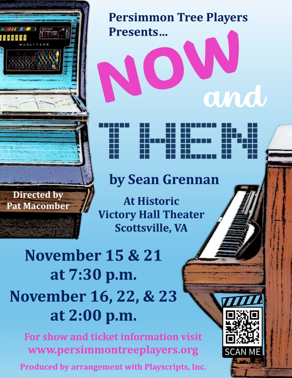 Tickets are on sale for the Persimmon Tree Player’s performances of Now and Then at Victory Hall Theater. Opening November 15, the show will run on November 15 and 21 at 7:30pm, and November 16, 22, and 23 at 2pm. Get tickets at www.persimmontreeplayers.org