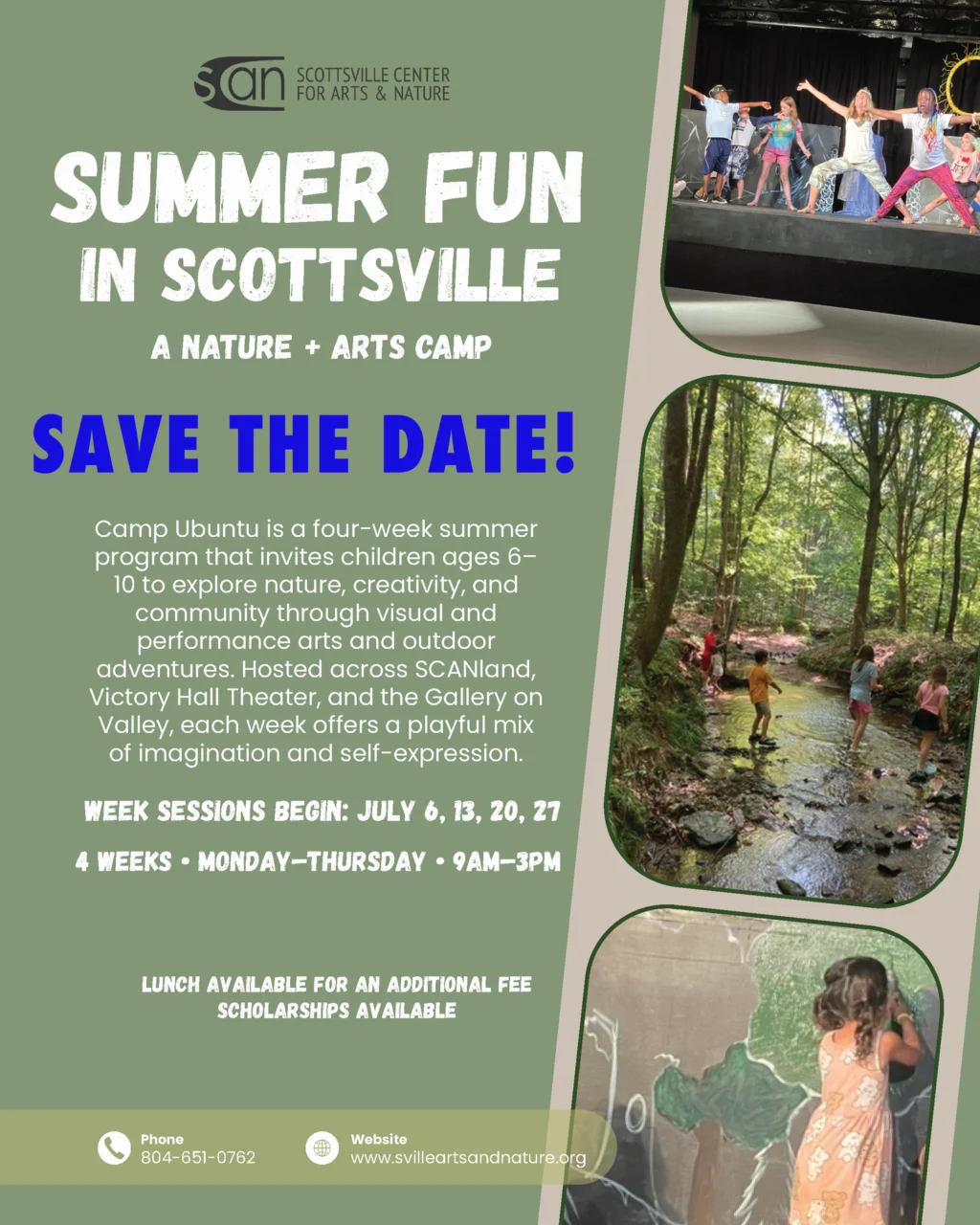 The Scottsville Center for Arts and Nature has announced its second year of youth camps! Camp Ubuntu is a four-week summer program held throughout July that invites children ages 6-10 to explore nature, creativity and community through visual and performance arts and outdoor adventures.